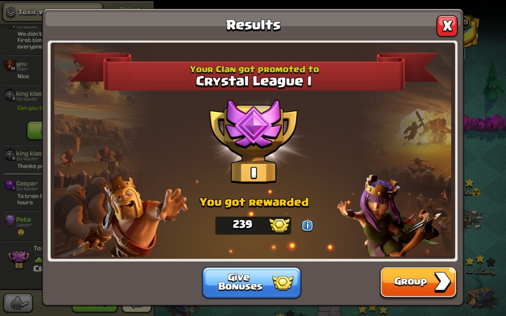 What I think we really enjoyed about this league season was the balance acroos the clans. Many of the wars were close and it went down to the wire at the end. And the final result was second place on identical trophies to the winners. Next season will be a test. Will their be engineered clans ? Do we have enough strength in depth ? Time will tell….